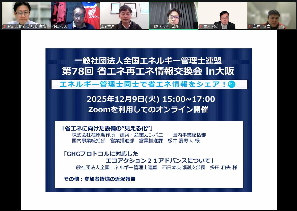 | 第78回省エネ再エネ情報交換会in大阪 | 2025年12月9日 | オンラインのみ | 19名 |
