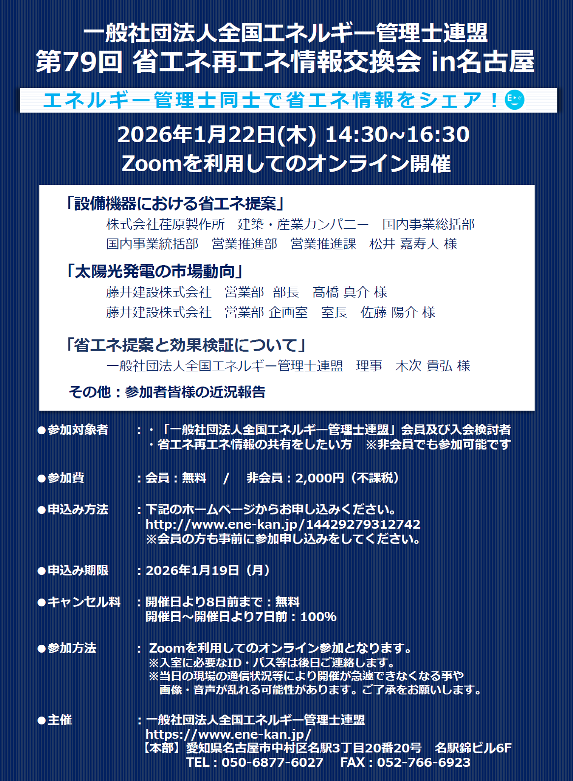 一般社団法人全国エネルギー管理士連盟の第79回省エネ再エネ情報交換会in名古屋を開催致します。