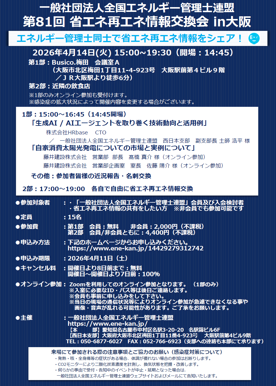 一般社団法人全国エネルギー管理士連盟の第81回省エネ再エネ情報交換会in大阪を開催致します。
